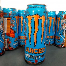 Boisson énergisante Monster, saveur Mangue ! Quantité : 500ml Ingrédients : eau, jus de fruits reconstitués à partir de jus concentrés (15%): raisin blanc, mangue, goyave, pomme, ananas, fruit de la passion, abricot, pêche, orange, citron, sucre, sirop de glucose, dioxyde de carbone, acide: acide...