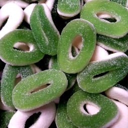 Ces anneaux saveur pomme sont un classique dans le domaine du bonbon, un extérieur acidulé avec un coeur fondant au délicieux goût pomme, un véritable délice ! Vendu par sachet de 100g. Ingrédients : Sirop de glucose, sucre, gélatine, Acidifiants : acide citrique et acide lactique , Agent...