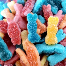 Le Lapin Crétin acidulé à croquer avant qu'il ne s'échappe ! Vendu par sachet de 100g. Ingrédients : SIROP DE GLUCOSE-FRUCTOSE - SUCRE - GÉLATINE - ACIDIFIANTS (ACIDE CITRIQUE, ACIDE MALIQUE) - CORRECTEUR D'ACIDITÉ (MALATE DE SODIUM) - ARÔMES - COLORANTS (E120, E133, E161B).