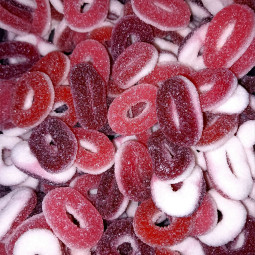 Ces anneaux saveur fruits rouges sont un classique dans le domaine du bonbon, un extérieur acidulé avec un coeur fondant au délicieux goût fruits rouge, un véritable délice ! Vendu par sachet de 100g. Ingrédients : Sirop de glucose, sucre, gélatine, Acidifiants : acide citrique et acide lactique...