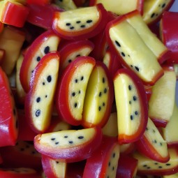 Ces tranches de fruits de la passion sont à la fois amusantes et fortement savoureuses, il s'agit d'un bonbon qui peut être épluché pour être dégusté, même les pépins à l'intérieur peuvent être extraits du bonbon ! De plus, il est doté d'un goût intense de fruits de la passion ! Vendu par sachet...