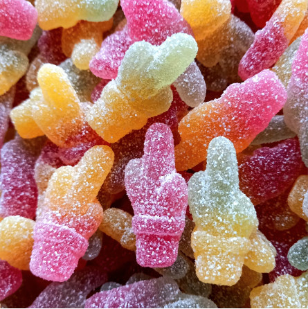 Ingrédients : sirop de glucose, sucre, eau, gélatine, acidifiants, : acide citrique, acide malique, correcteur d'acidité : malates de sodium, arômes naturels, arôme naturel de pomme avec autre anthocyanes, curcumine, arôme naturel de citron avec autres arômes naturels. Amidon de Blé