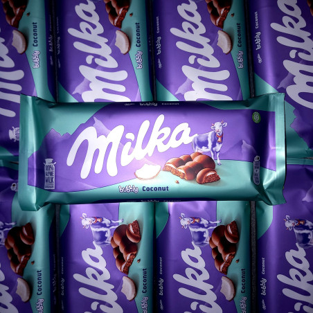 Découvre la tablette Milka Bubbly Coconut, une délicieuse tablette de chocolat dotée de ce goût si spécifique qui est propre à Milka, avec un cœur fondant à la noix de coco !