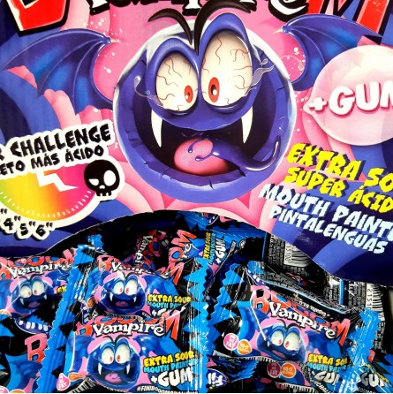Chewing-gum vampire, attention ils sont acides avec un liquide au centre et ils colorent la langue, idéal pour faire peur et amuser les enfants !