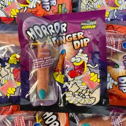 Sucette enveloppée individuellement en forme de doigt à tremper dans une poudre acidulée, de quoi en effrayer plus d'un le soir d'Halloween !