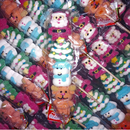 Les Christmas Mallow sont de délicieuses brochettes de marshmallows moelleux au goût fraise, enrobés d’une fine poudre acidulée. Chaque brochette représente les symboles de Noël : Père Noël, sapin, bonhomme de neige et renne !